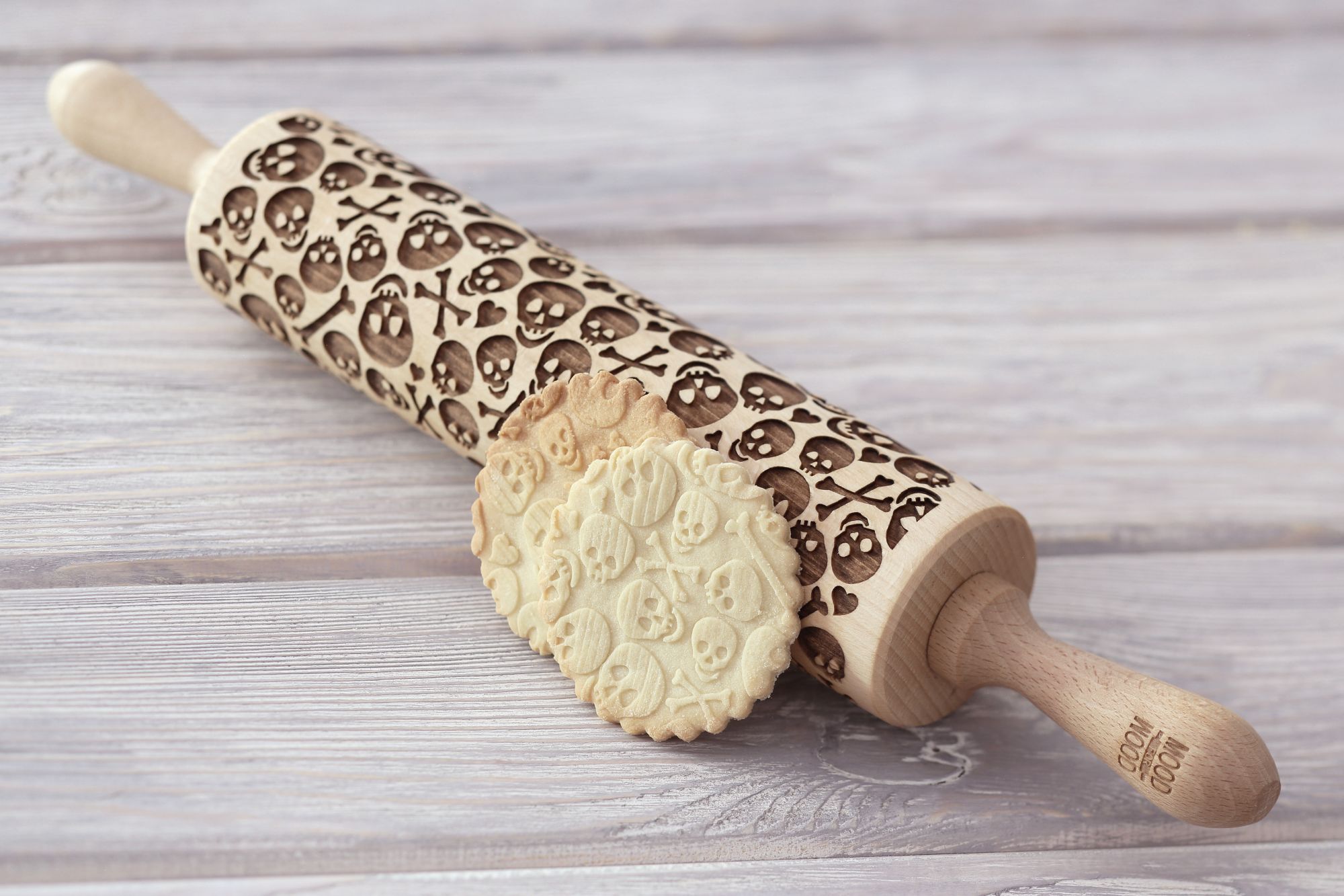 Unique engraved beech rolling pin with skull design adds character to every bake. Perfect choice for families and Halloween lovers.