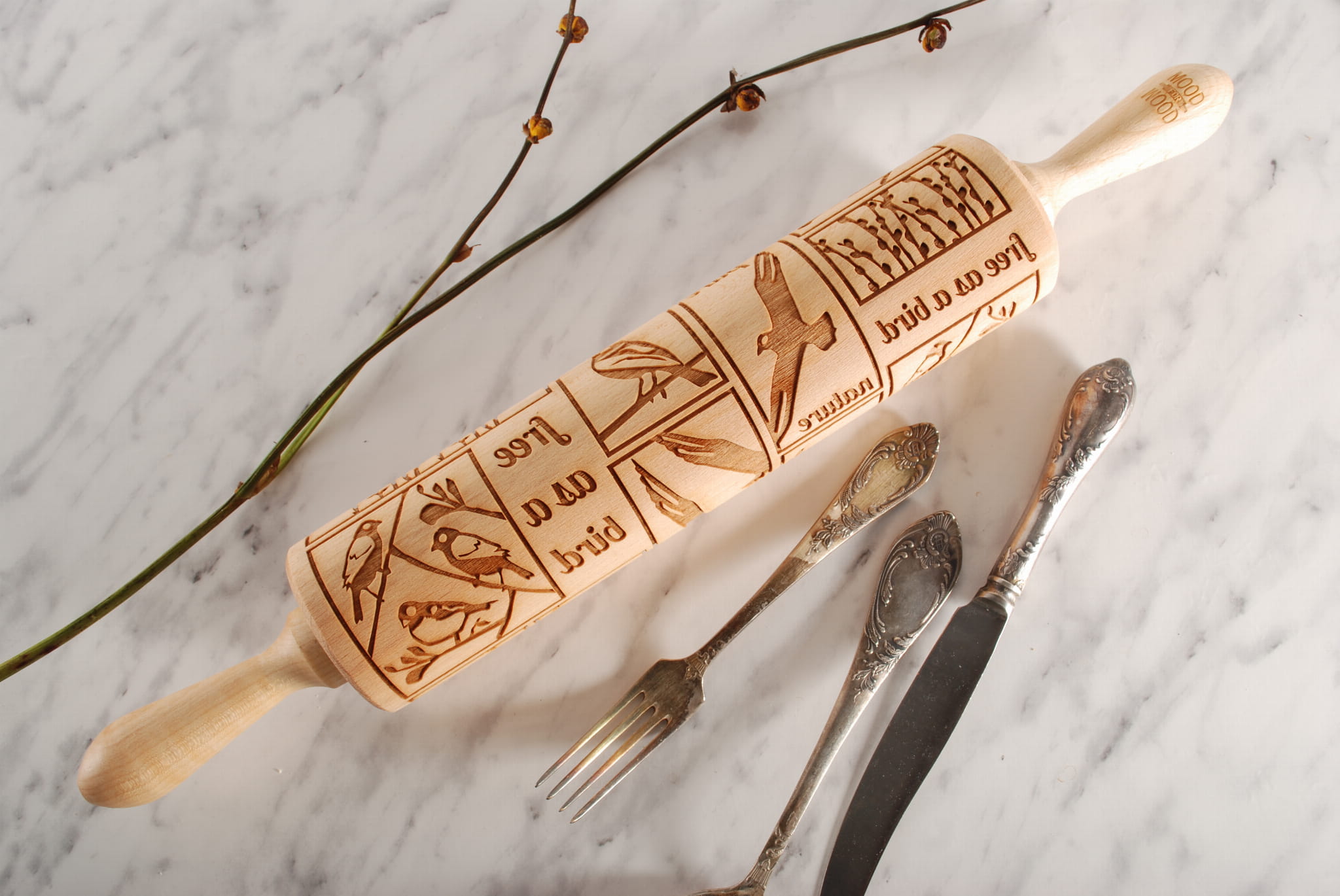 A2: Bukowy wałek z motywem ptaków wprowadza ciepło i subtelny klimat natury na blacie.